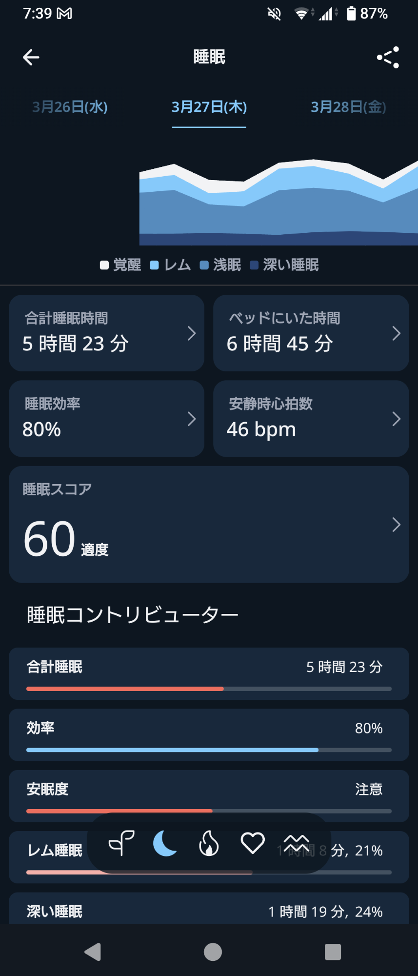 昼間の活動量が低く、グッスリ眠れなかった日は80点。
