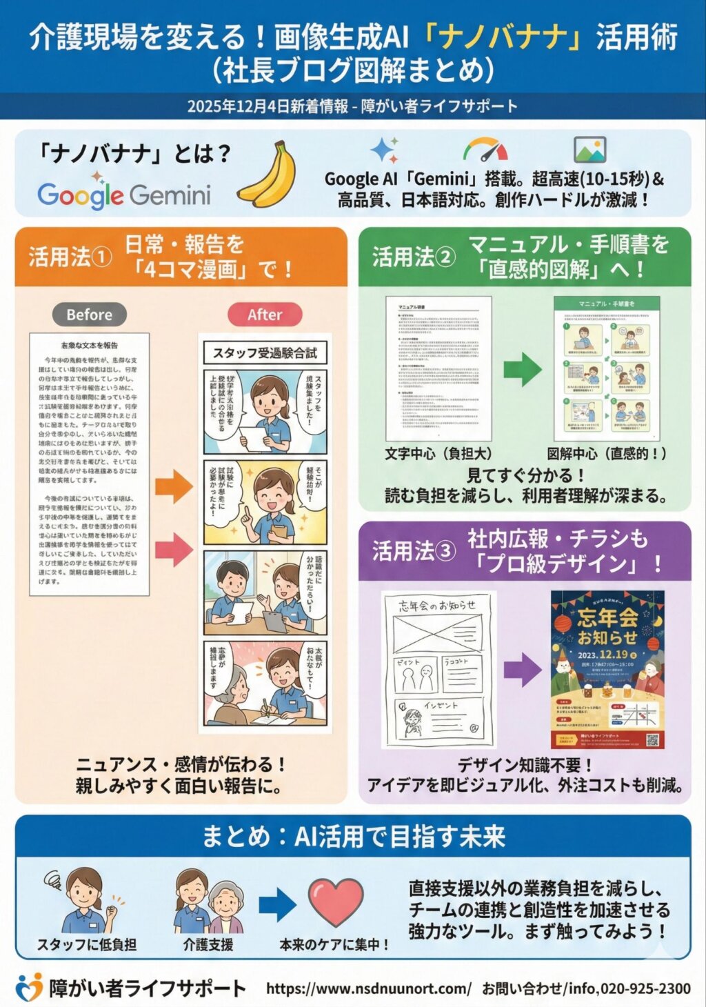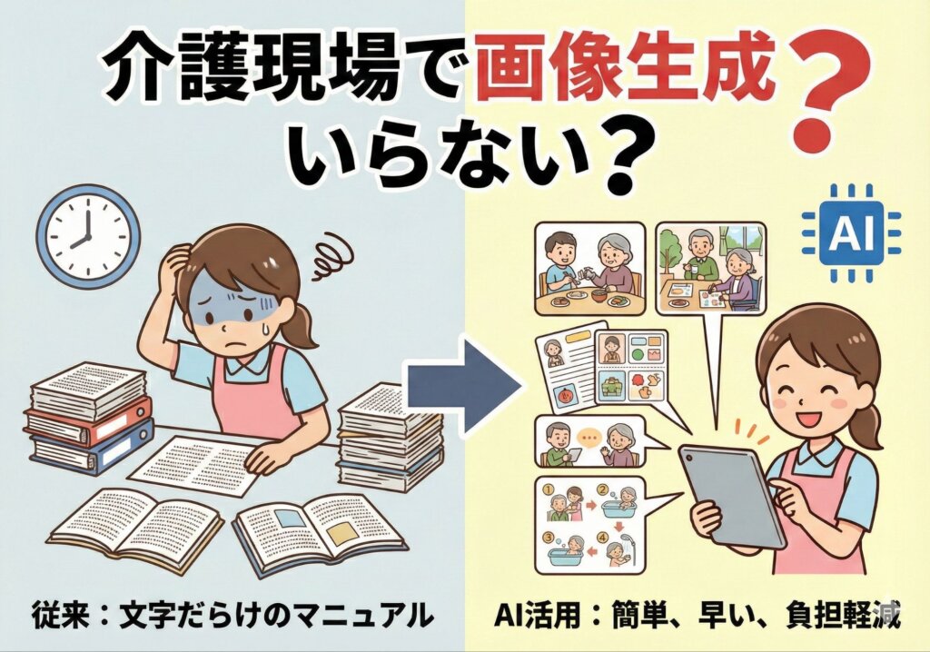 ナノバナナは介護現場のアセスメントシートやマニュアルを、文字中心から図解中心に変える力がある。