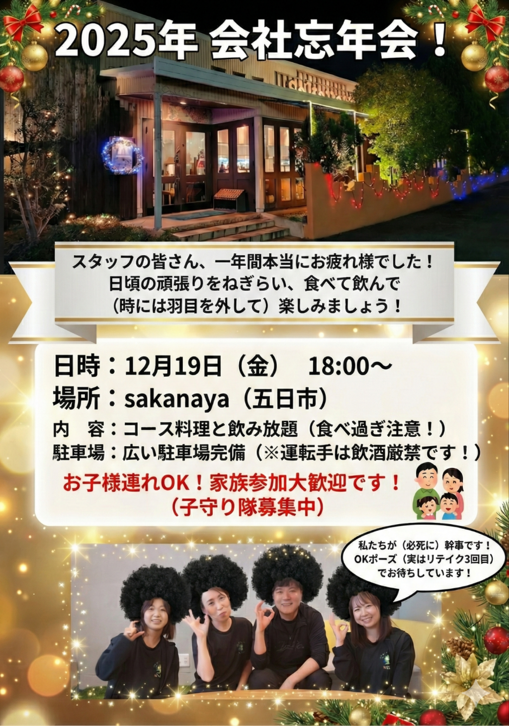 ナノバナナは忘年会の案内や事業所の活動報告みたいな、社内向けのチラシ作成にも使える。