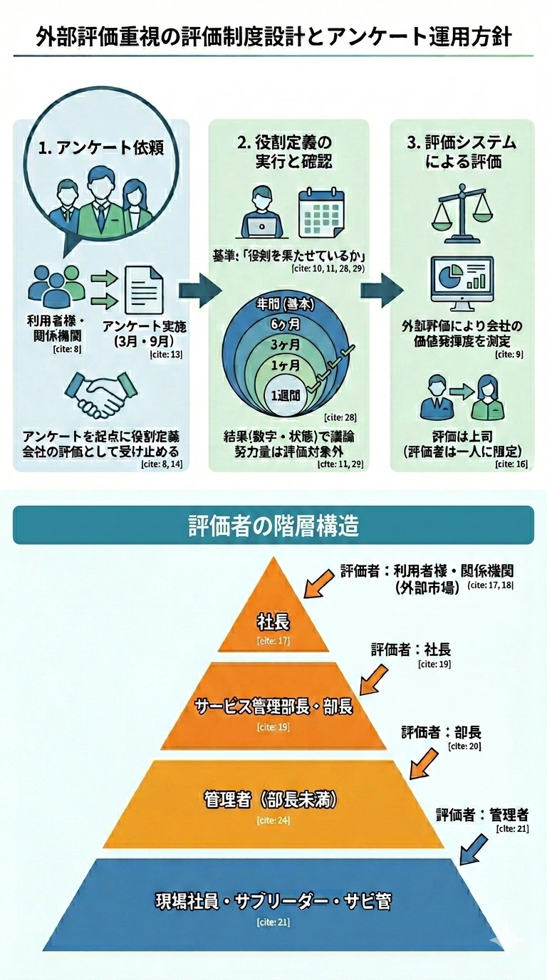 役職が上になるほど、その評価者は「市場」、つまり利用者様・関係機関に変わっていく。
